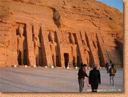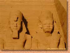 in Felsnischen 10 m hohe Statuen des Königs und der als Hathor dargestellten
